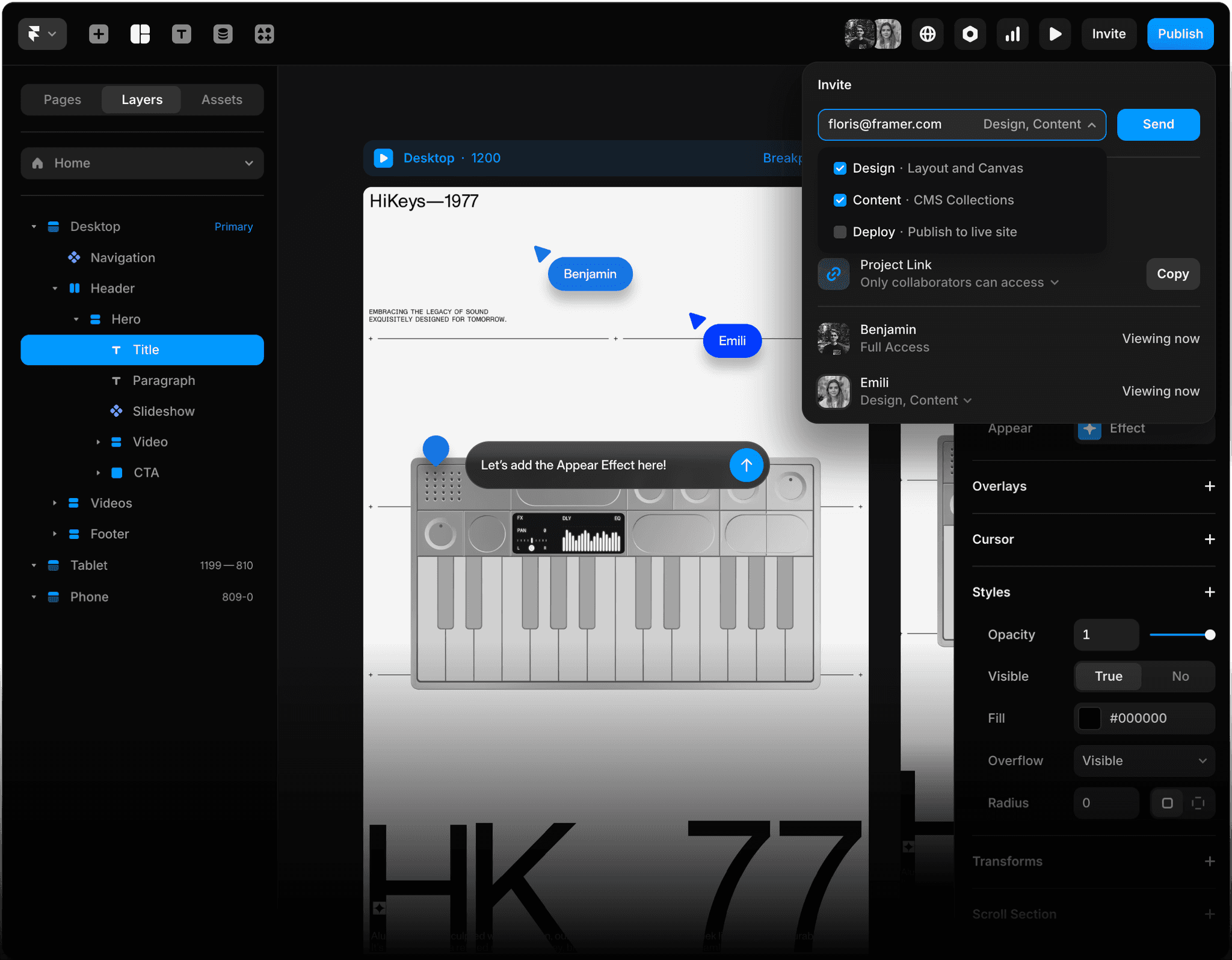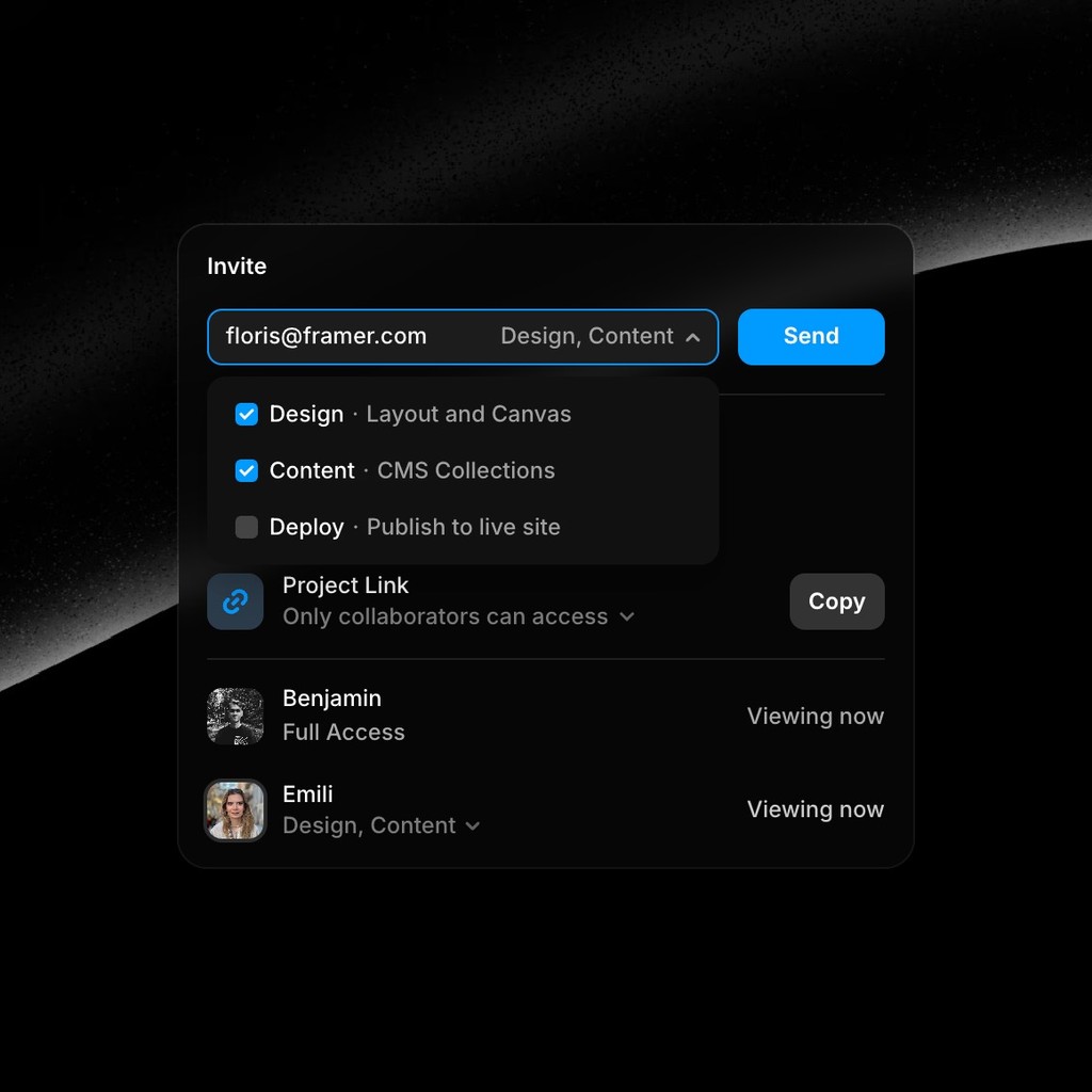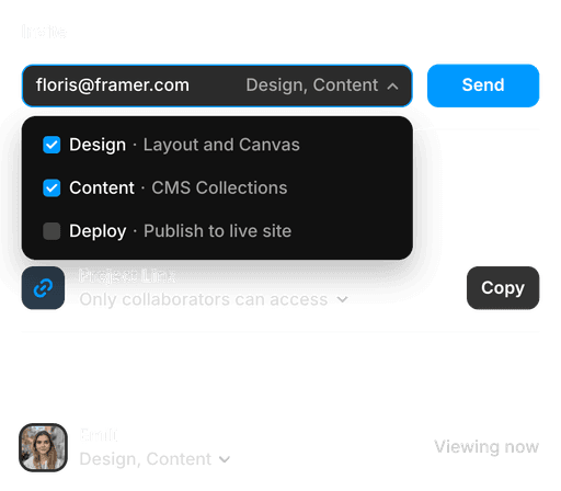 Custom permissions give you full control—decide who can design on canvas, edit the CMS, and publish your site.