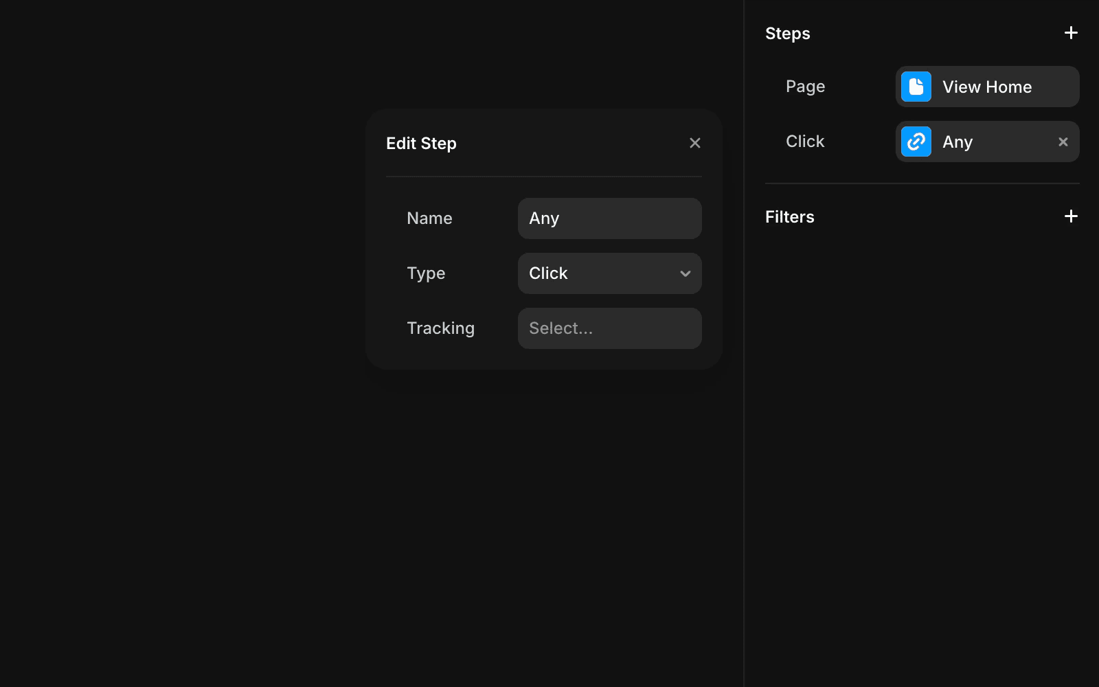 Once you’ve added your changes, it’s time to configure your test. Click the Configure button on the banner shown while viewing your page. The Analytics tab will open, and you’ll be prompted to select a step to count as the conversion step. In the right panel, click the + icon next to Steps, and choose the type of event you want to use as the conversion. You can add multiple steps, but the last step will be used to calculate the conversion rate and measure results.